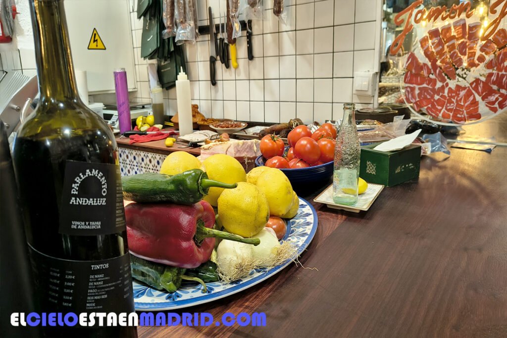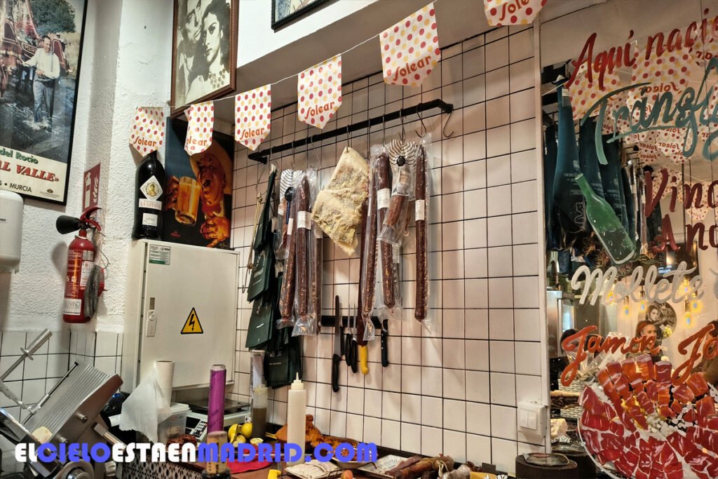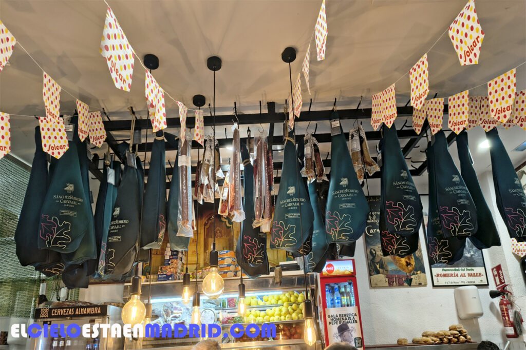 Al entrar, tu primera impresión es más que andaluza: jamones ibéricos colgados, azulejos, vinos andaluces, farilillos y banderines…