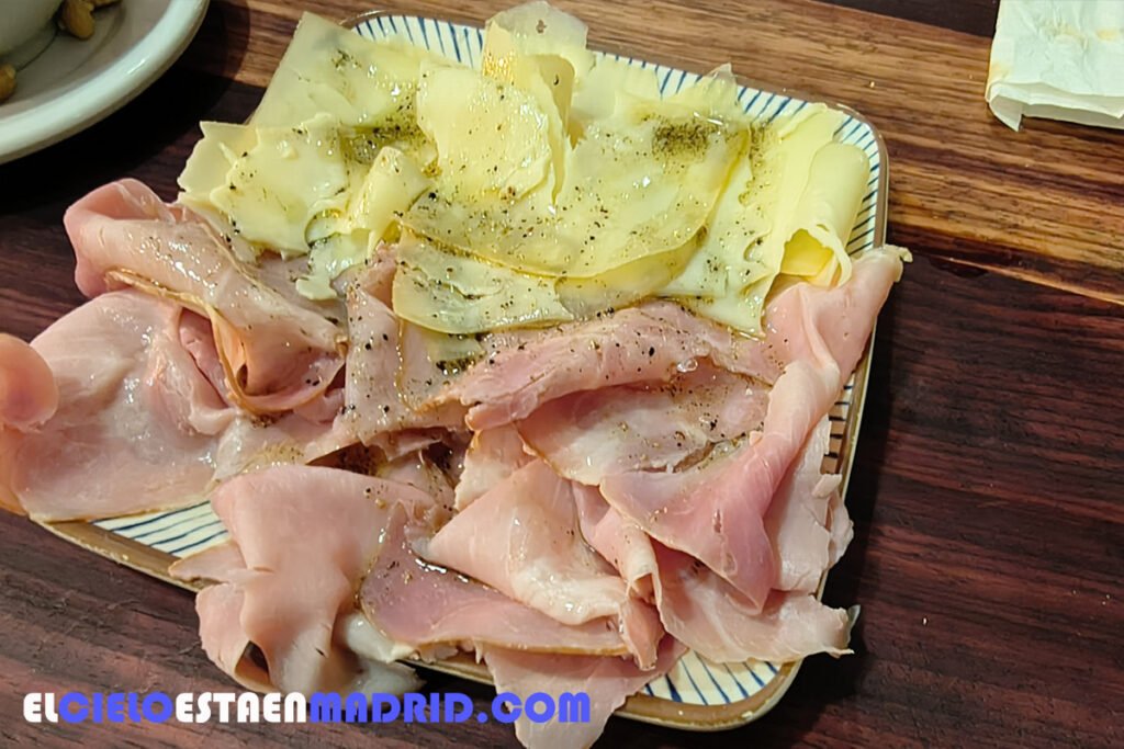 Un plato de jamón asado y queso Maasdam, todo cortado en finísimas lonchas y aliñado con aceite de oliva virgen extra, pimienta negra en polvo y un chorro de limón (esto último es el aporte murciano al sabor del plato).