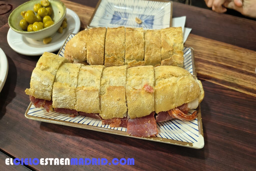 Llegamos ya a plato más consistente: un «parlamentario«, que se compone de tocino de ibérico 100%, de bellota, de Jabugo (no caben más piropos), jamón ibérico de bellota con todos sus adjetivos, chorizo (sesos de avispa, lo llaman) picante, tomate «restregao» y aceite de oliva virgen extra. Todo ello dentro de una barra de pan crujiente.