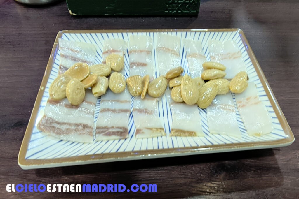 A continuación un platito con el mejor tocino ibérico que uno pueda tomar cortado finísimo y acompañado de almendras (lo de acompañar con almendras todo lo que sea es muy de Murcia).