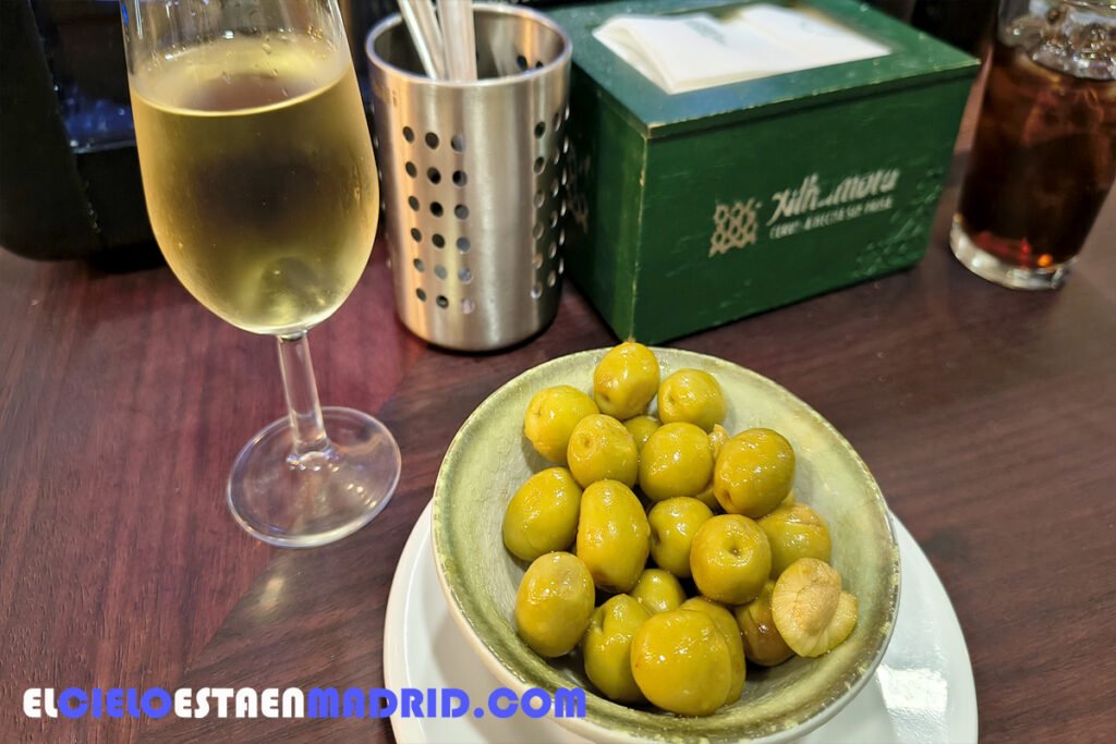 Tomamos una excelente manzanilla de entrada, acompañada de unas aceitunas aliñadas, muy al estilo andaluz. Muy ricas. Y también unas patatas fritas típicas de Mula. A mi me gusta llamarlas patatas entrecot porque son grandes, gruesas y fritas con poco aceite de oliva. Una cosa muy especial.